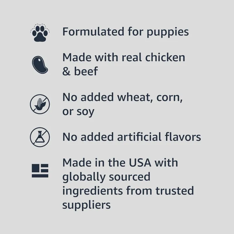 Give your growing pup the nutrition they need with Amazon Basics Puppy Chopped Ground Dinner Canned Dog Food—a wholesome, protein-rich meal made with real chicken and beef. This 13.2 oz (Pack of 12) canned dog food is formulated specifically for puppies, offering a soft, palatable texture and balanced nutrition to support healthy growth and development.