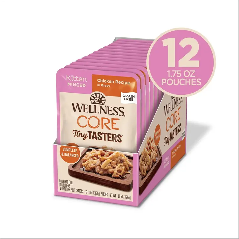 Give your kitten the perfect start with Wellness CORE Tiny Tasters Minced Kitten Wet Cat Food, Chicken Recipe. This 12-pack of 1.75-ounce pouches delivers protein-rich, natural nutrition in a tender minced texture that’s irresistible to growing cats. Made with boneless chicken as the first ingredient, plus added duck, eggs, and chicken liver, each pouch offers a complete and balanced diet designed to support healthy development.