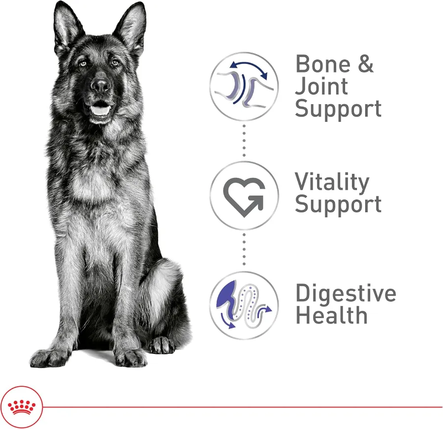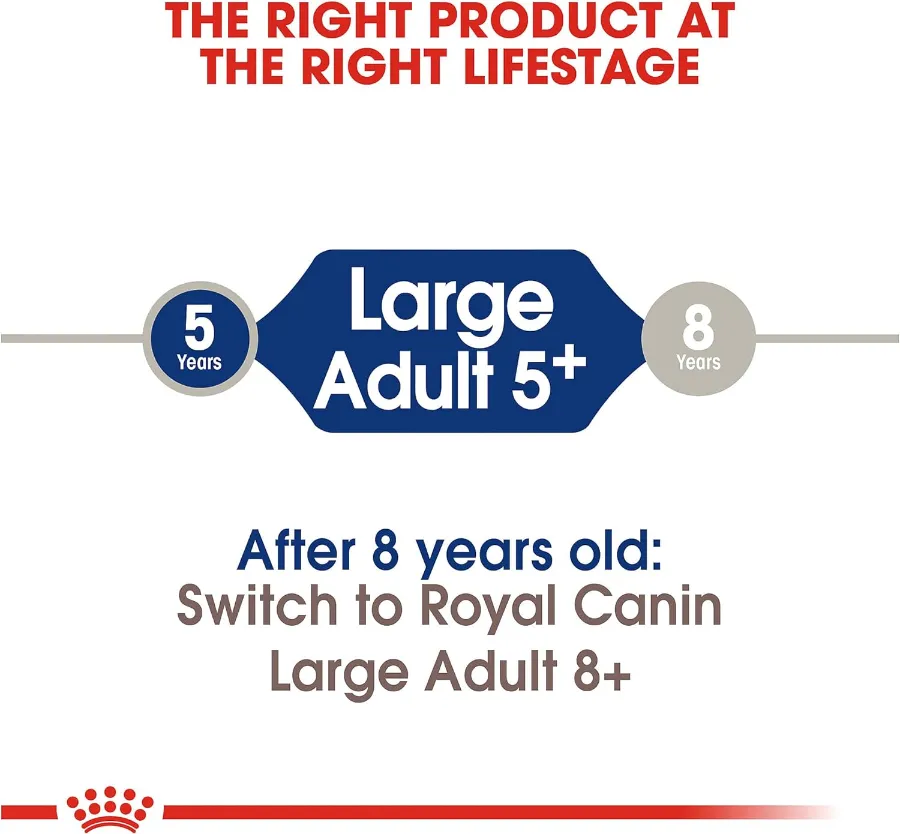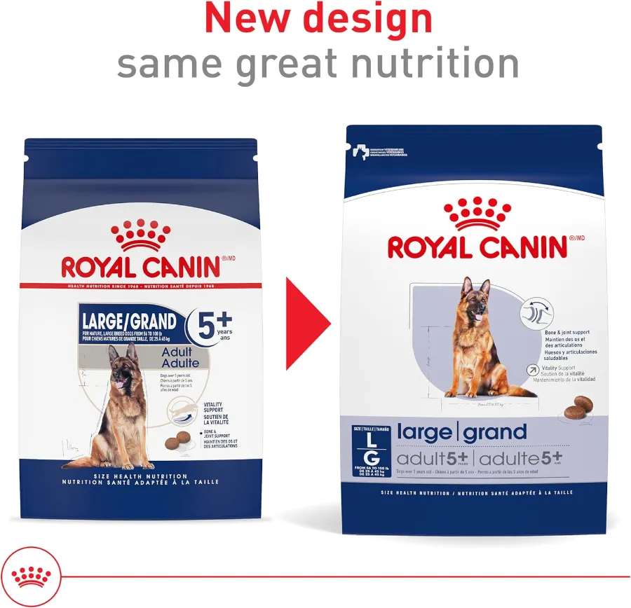 Support your large breed dog’s health as they age with Royal Canin Size Health Nutrition Large Adult 5+ Dry Dog Food. Specially formulated for dogs aged 5 to 8 years and weighing between 56 to 100 lbs, this dry kibble helps maintain vitality with a precise blend of antioxidants, vitamins, and minerals. Key nutrients like glucosamine and chondroitin promote joint and bone health, while L-carnitine supports healthy weight and muscle mass.